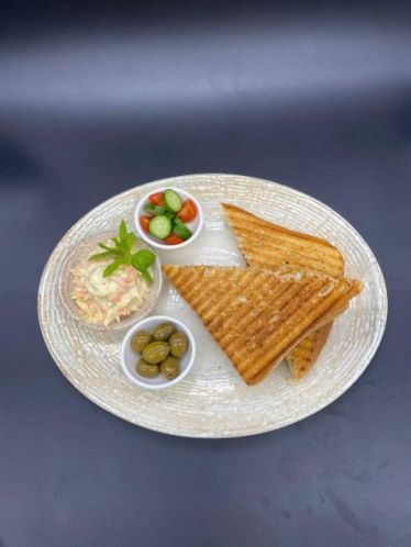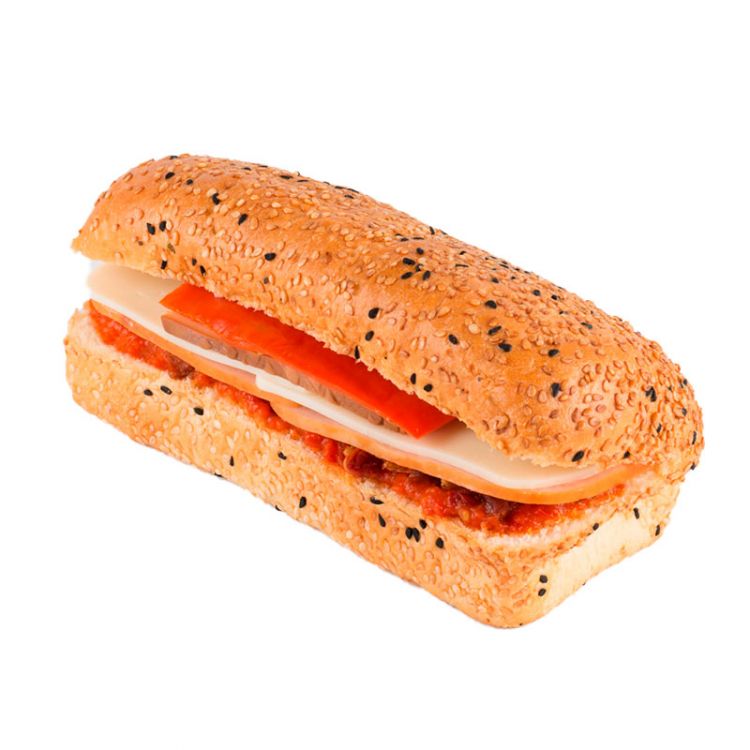 255 - 9,11Панини с черным тмином и кунжутом, копченая индейка, желтый сыр, копченая черкеска, вяленые помидоры, красная капия, паста из красного перца